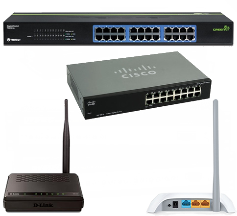 Switches y routers de las marcas TP-Link, D-Link y CISCO.